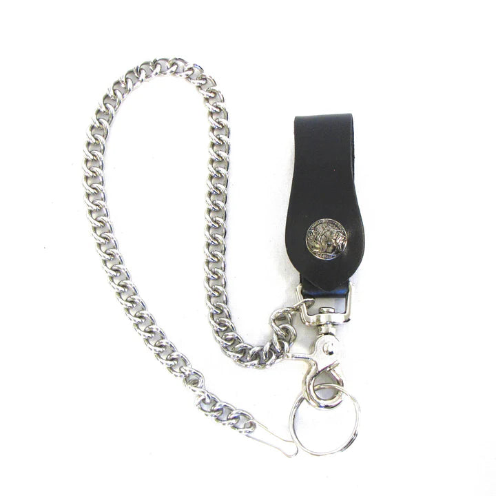 This Vintage style Steel Chain is Simple but Sturdy and will keep your wallet where it needs to be. The Leather loop, decorated with a skull concho, attaches to your jeans and the split ring attaches to your wallet. Chrome plated. Ride down and get yours in our shop just outside Nashville in Smyrna, TN.