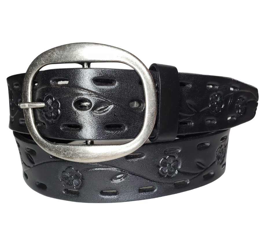 Named for our Western belt designer’s daughter, this two-tone vegetable leather belt with high-low texture in the 70's influenced embossed detailing and colors finished one by one by our artisans in LA makes a great jean belt. It's 1 1/2" wide and includes snaps for easy buckle change. The buckle is a center bar style made of brass, A classy retro look for anyone! A steal at this price!! Made in USA by Brighton for Tony Lama. Available at our Smyrna, TN shop.