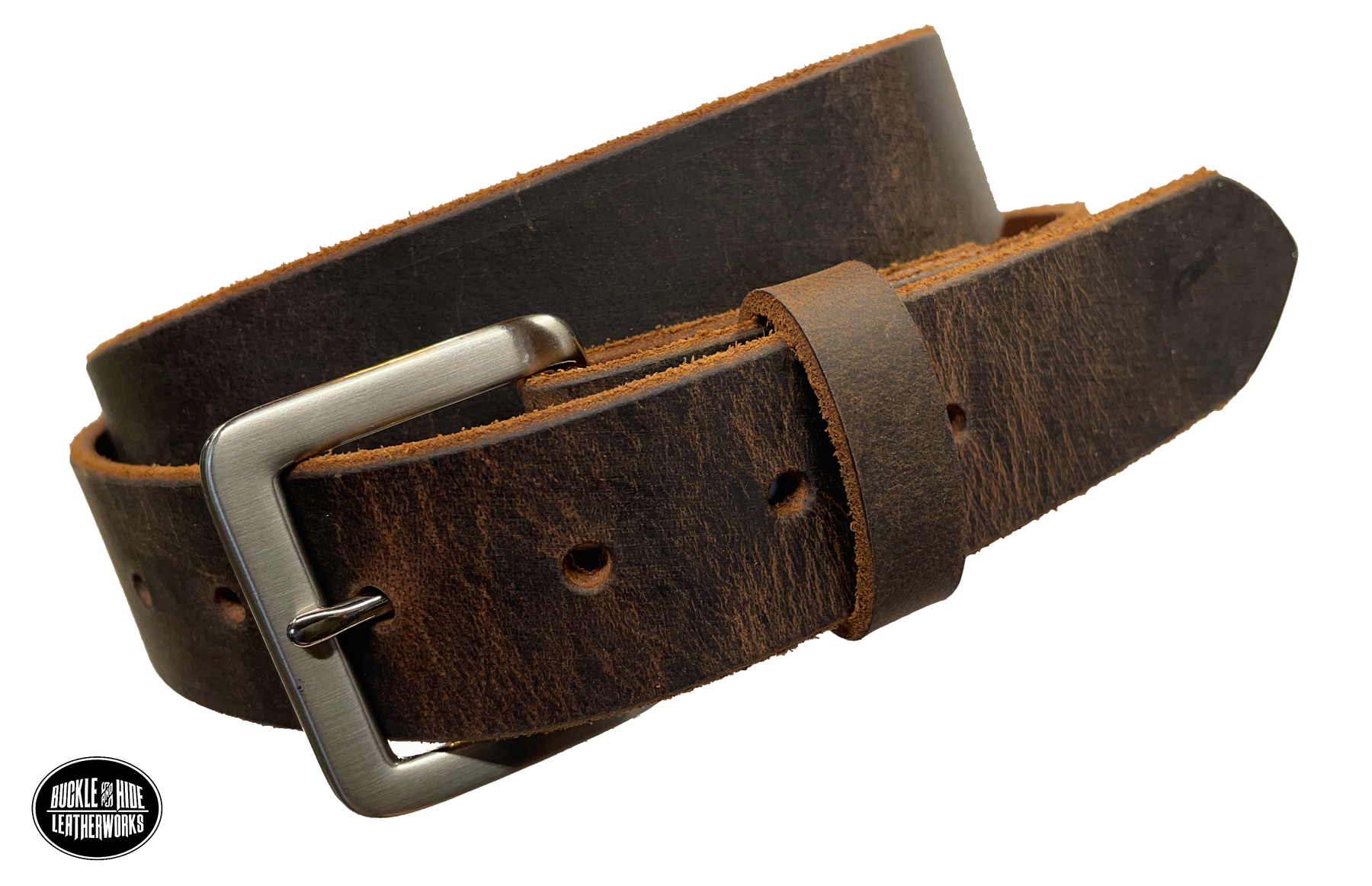 This brown leather belt is made from Crazy Horse tanned leather for that distressed and pull-up look. The edges are beveled and left raw for a contrasting look. It has an antique nickel coated solid brass buckle that is snapped in place. Belt is 1 1/2" wide and available in lengths from 34" to 44". It is handmade in our shop in Smyrna, TN, just outside of Nashville. PLEASE READ OUR SIZING INFO BELOW AND SEE OUR MEASURING CHART ON HOW TO PROPERLY MEASURE YOUR "REAL" BELT SIZE How to measure belt size