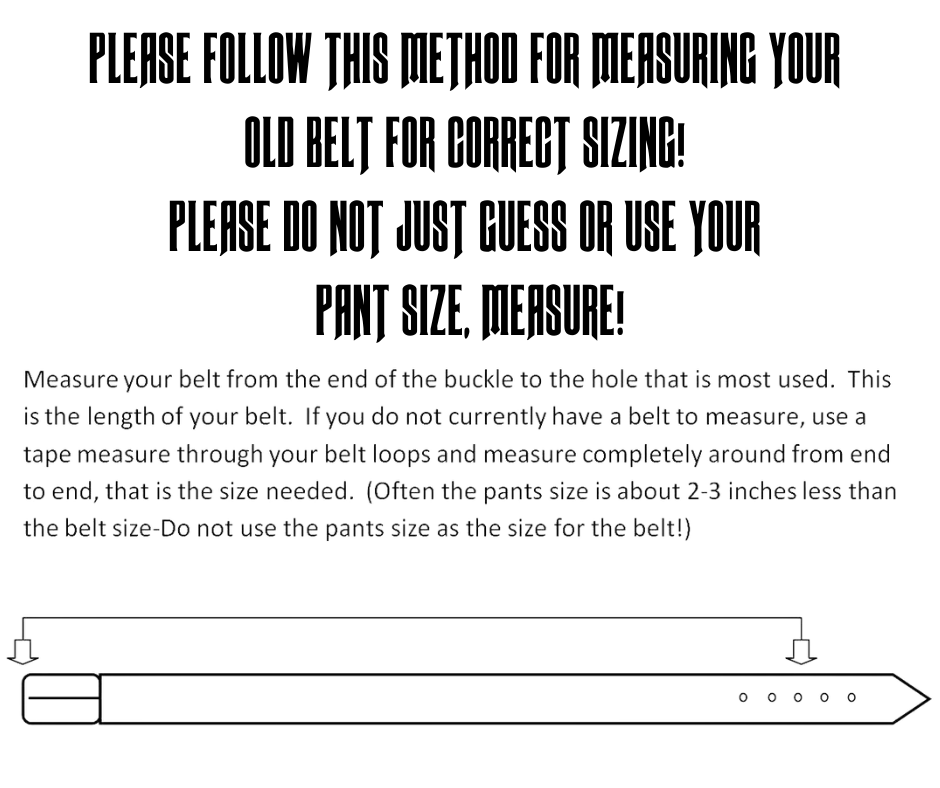 * PLEASE READ and review the measuring instructions pictured with the belt to the left. The easiest way to get your size is to take your everyday belt and simply measure it according to our instructions. Your belt size IS NOT the entire length of your current belt!