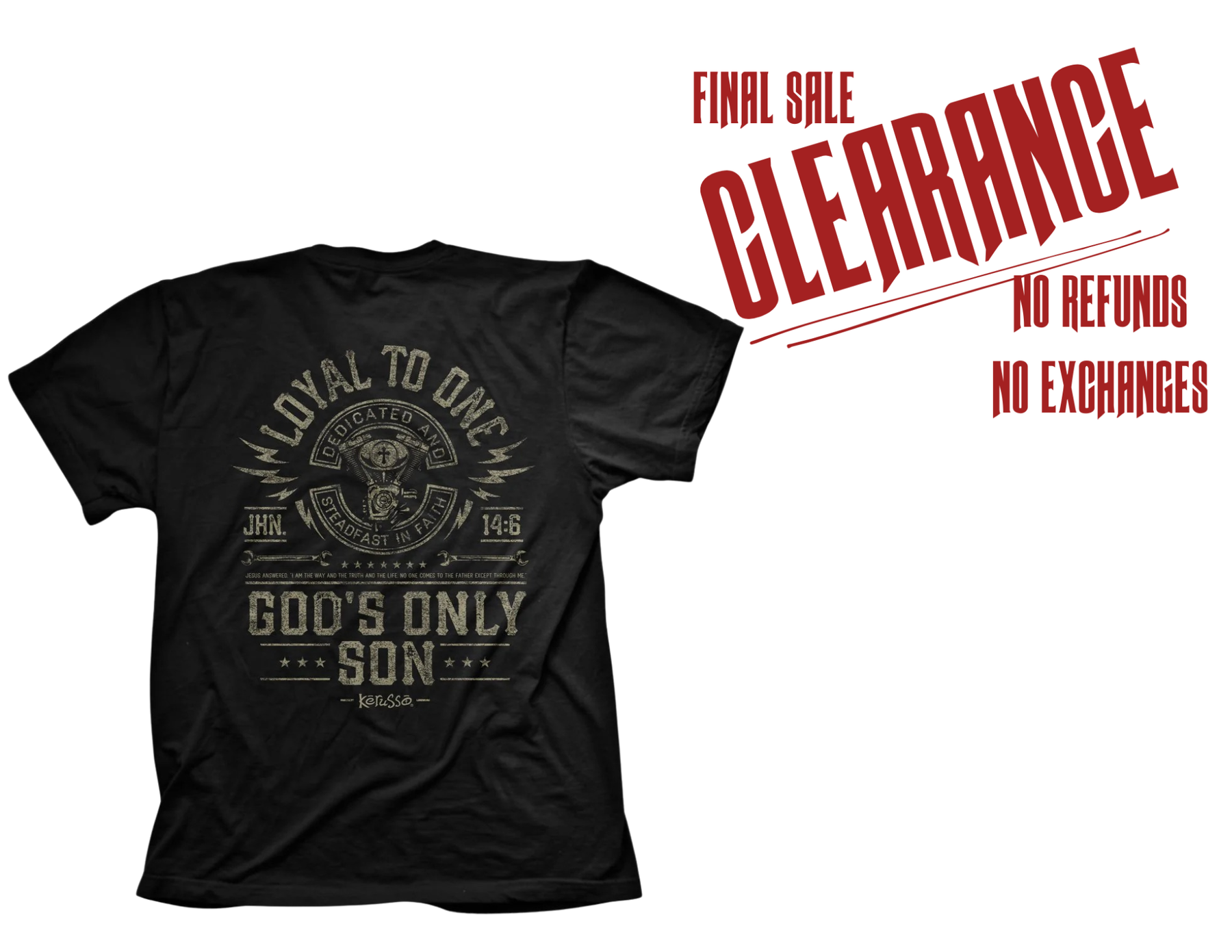 Show your dedication to Jesus in this soft classic “Loyal” bike themed T-Shirt in Black. When you consider who is on your team, who you really trust, and who you know you can count on when the going gets tough, the number one answer should be Jesus. He loves us so much He gave His life for us, and it is right that we should commit our lives, hearts, and loyalty to Jesus Christ as faithful Christian believers. Sizes S-4X Sold online and in our retail shop in Smyrna, TN.