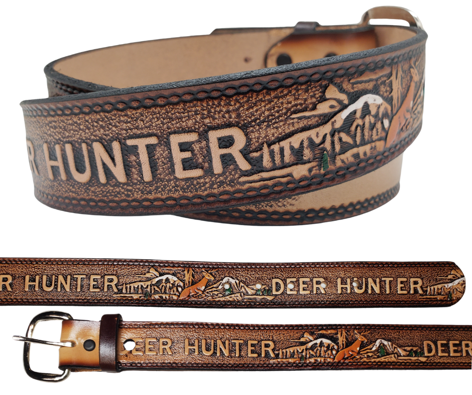 PLEASE SEE OUR MEASURING CHART ON HOW TO PROPERLY MEASURE YOUR REAL BELT SIZE  How to measure belt size  This Buck Fever all leather Name belt features a Deer Hunting pattern in an antiqued finish with a 1 1/2" width. It is crafted from full grain veg-tanned cowhide, with smooth burnished painted edges and a nickel-plated buckle. For customizing, simply type your desired name or No Name in the "Type Name Here" section,  the buckle can be easily interchanged as well. This product is in stock at our Smyrna, TN shop.
