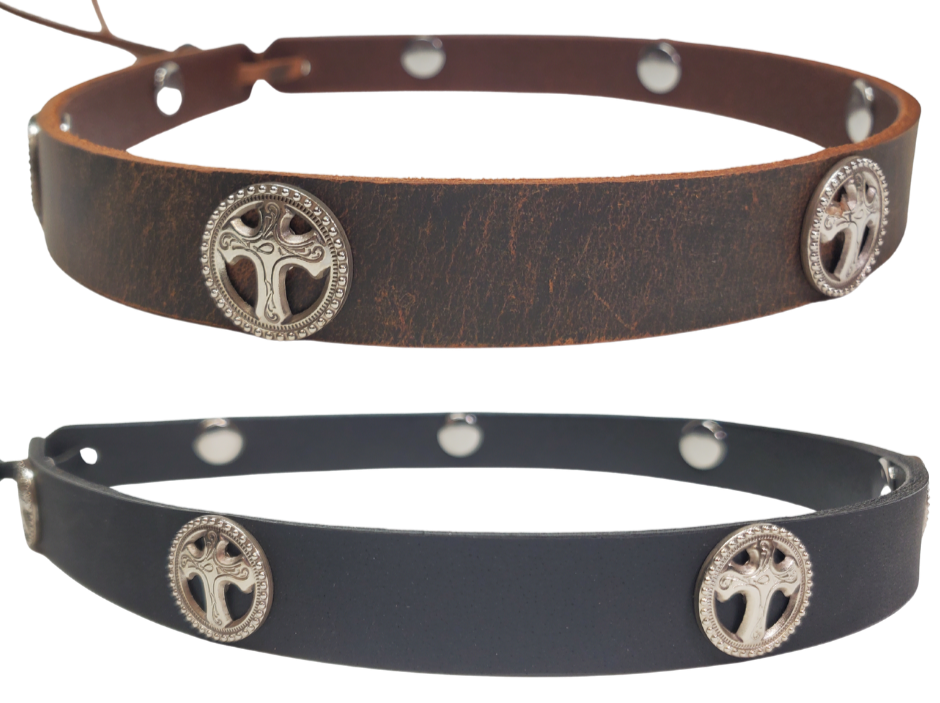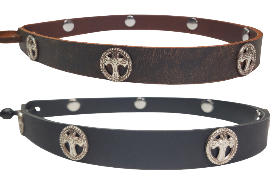 Our 7 Cross Concho leather hatband is 3/4" wide by 23" (without tie string). Available in black or brown, pick one or a few. Fit's most any hat with adjustable bead and leather 1/8" string. Will fit most TOP HAT style and WESTERN crowned hats. Made in our Smyrna Tn. shop.