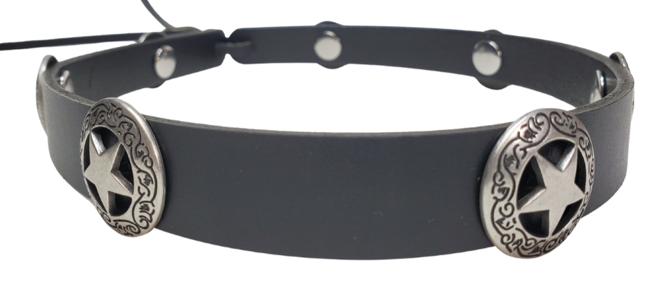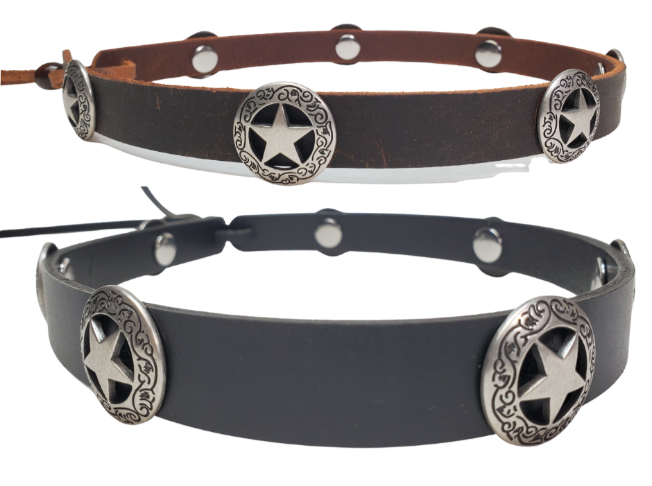 Our 7 Western Star Concho leather hatband is 3/4" wide by 23" (without tie string). Available in black or brown, pick one or a few. Fit's most any hat with adjustable bead and leather 1/8" string. Will fit most TOP HAT style and WESTERN crowned hats. Made in our Smyrna Tn. shop.