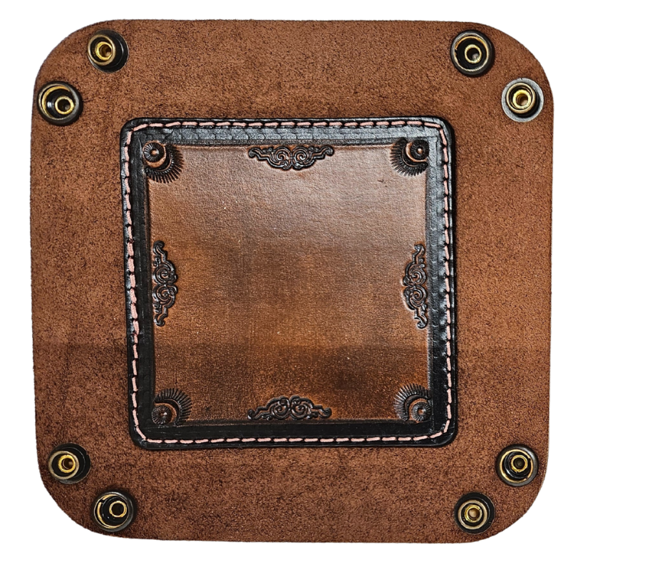 The Franklin is a little different than our other trays because of the Hand Stamped and stained inside layer. Outer layer is a Bison brown color with the inside layer being stitched in. The corners are held together with heavy line 24 Antique Brass colored snaps, for laying flat for travel, a place for placing keys, wallet, coins, etc. Made in our shop just outside Nashville in Smyrna, TN.