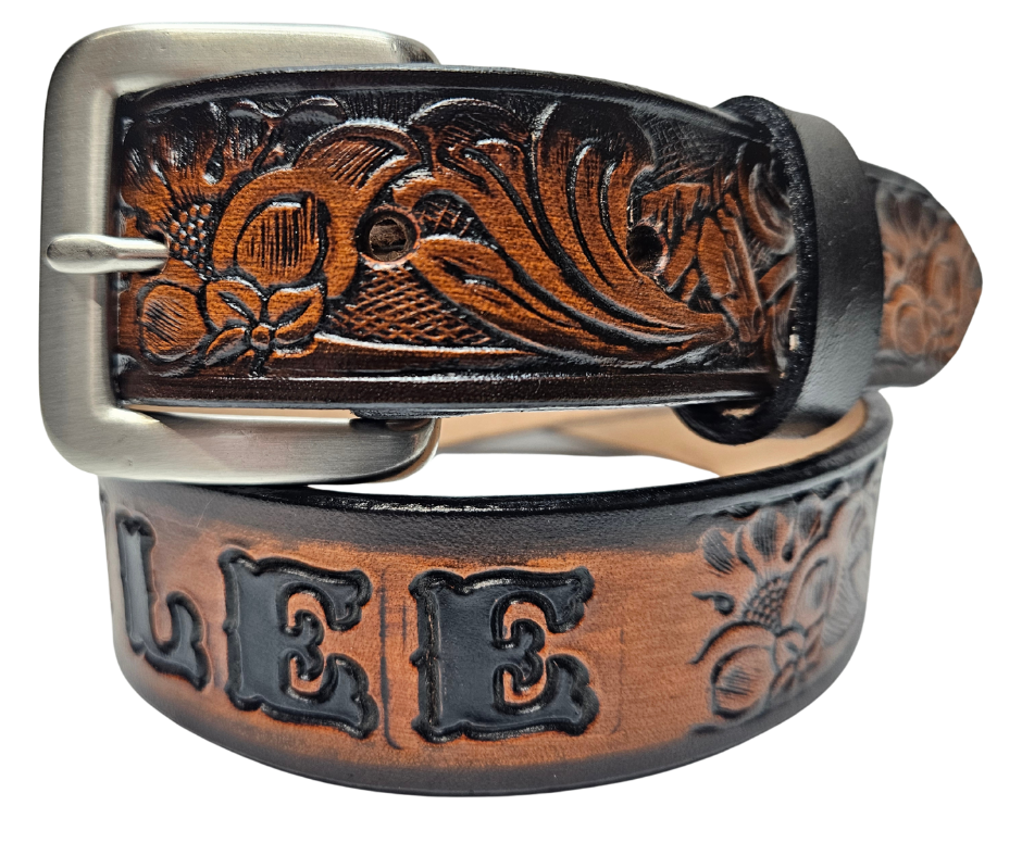 This solid strip of Veg Tan cowhide, is hand stained in 3 brown options, with smooth, finished edges. Embossed with Western Vine down length of belt, or have name added to scene up to 8 letters. Belt thickness is approx. 1/8", and 1 1/2" wide. Sizes available are 34" to 44" from buckle end to hole most worn. Attached with 2 snaps is a Brushed Nickel plated solid brass buckle. PLEASE READ OUR SIZING INFO BELOW AND SEE OUR MEASURING CHART ON HOW TO PROPERLY MEASURE YOUR "REAL" BELT SIZE How to measure belt size