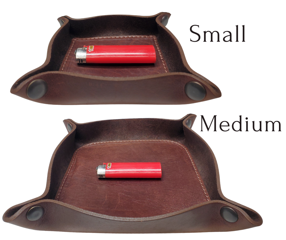 Make it PERSONAL! This handmade real leather valet tray can be personalized with up to 8-10 letters. It has Antique Brass SNAPPED corners to FLATTEN out for easy packing for travel. It is made in our Smyrna, TN shop just outside Nashville. It is a perfect catch-all for keeping keys and other small items in one place at the end of a long day. Makes a great gift for groomsmen, or that special someone.