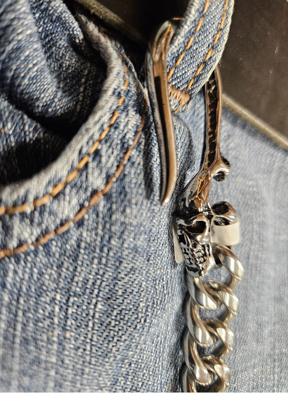 Your wallet chain can now BE AS TOUGH as the roads you travel! STAINLESS STEEL holds up and WILL NOT turn colors like the inexpensive wallet chains. The sturdy FLAT CUBAN STYLE hangs just right on your side. The key ring on one end attaches to your wallet, while the claw clasp on the other end attaches to YOU! Upgrade today!! Available right here online or in our shop just outside Nashville in Smyrna, TN.