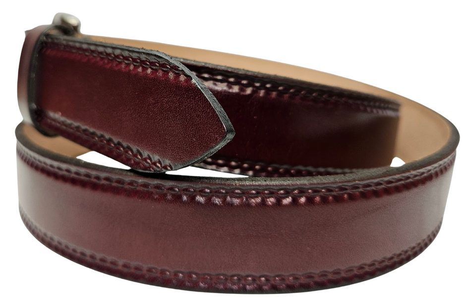 Our 1 1/4" Burywood Wine Casual Belt. Border embossing is just enough not to get in the way. It is constructed from full grain vegetable tanned cowhide. Choose a Antique Nickle or Brass over Solid brass Roller buckle along with painted edges. Made in the USA! Buckle snaps for easy changing. Available for quick shipment from our Smyrna, TN shop.