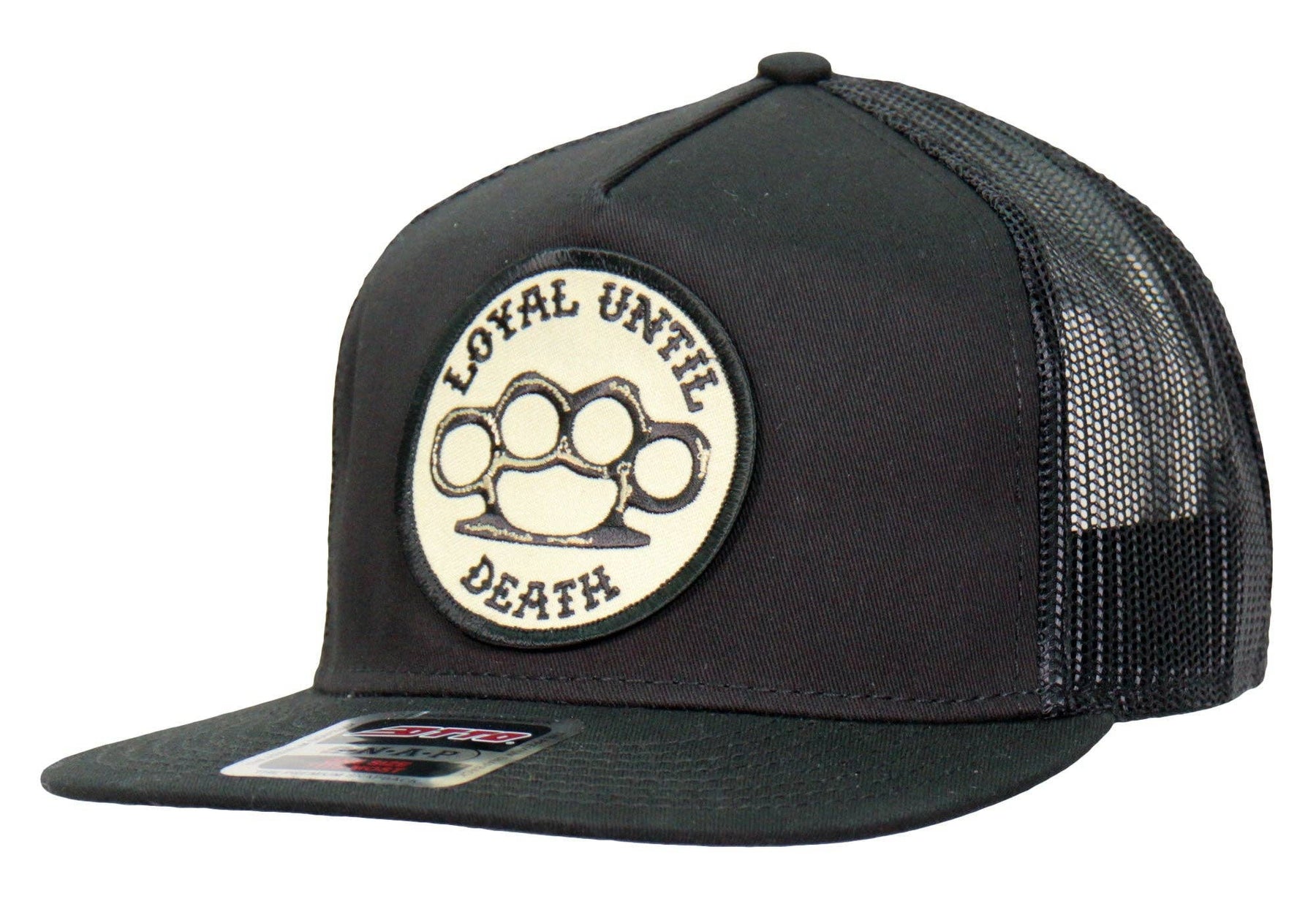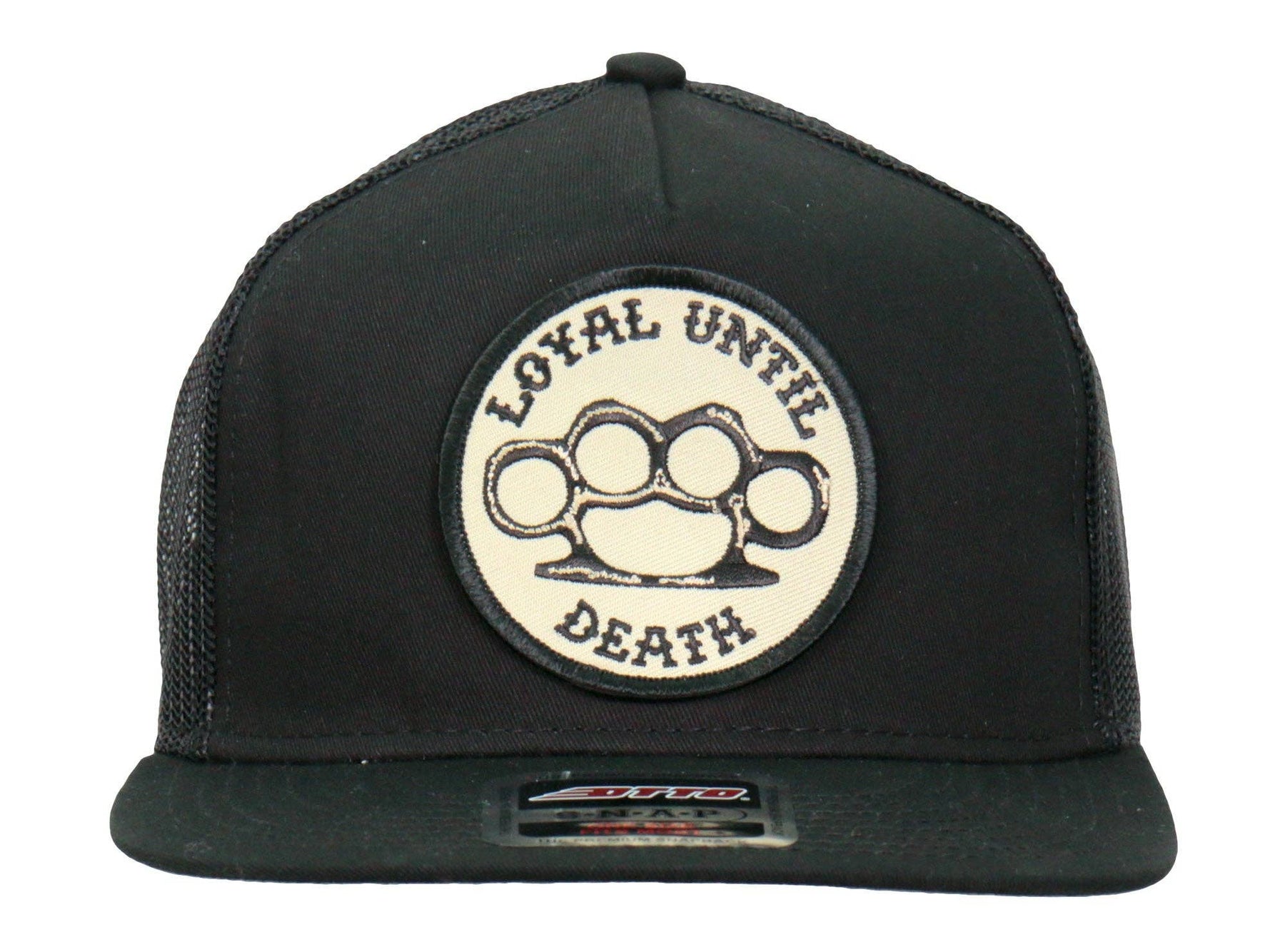 Loyal Until Death Patch flat bill Snap Back Hat. Its a cotton/polyester blend helps the hat hold its shape for long time use. Otto Brand mesh style back hat with a plastic adjustable tab. Ride to our Smyrna, TN shop not far from Murfreesboro.